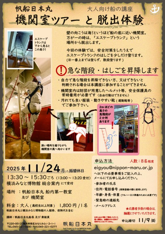帆船日本丸 船の講座「機関室ツアーと脱出体験」を開催します。